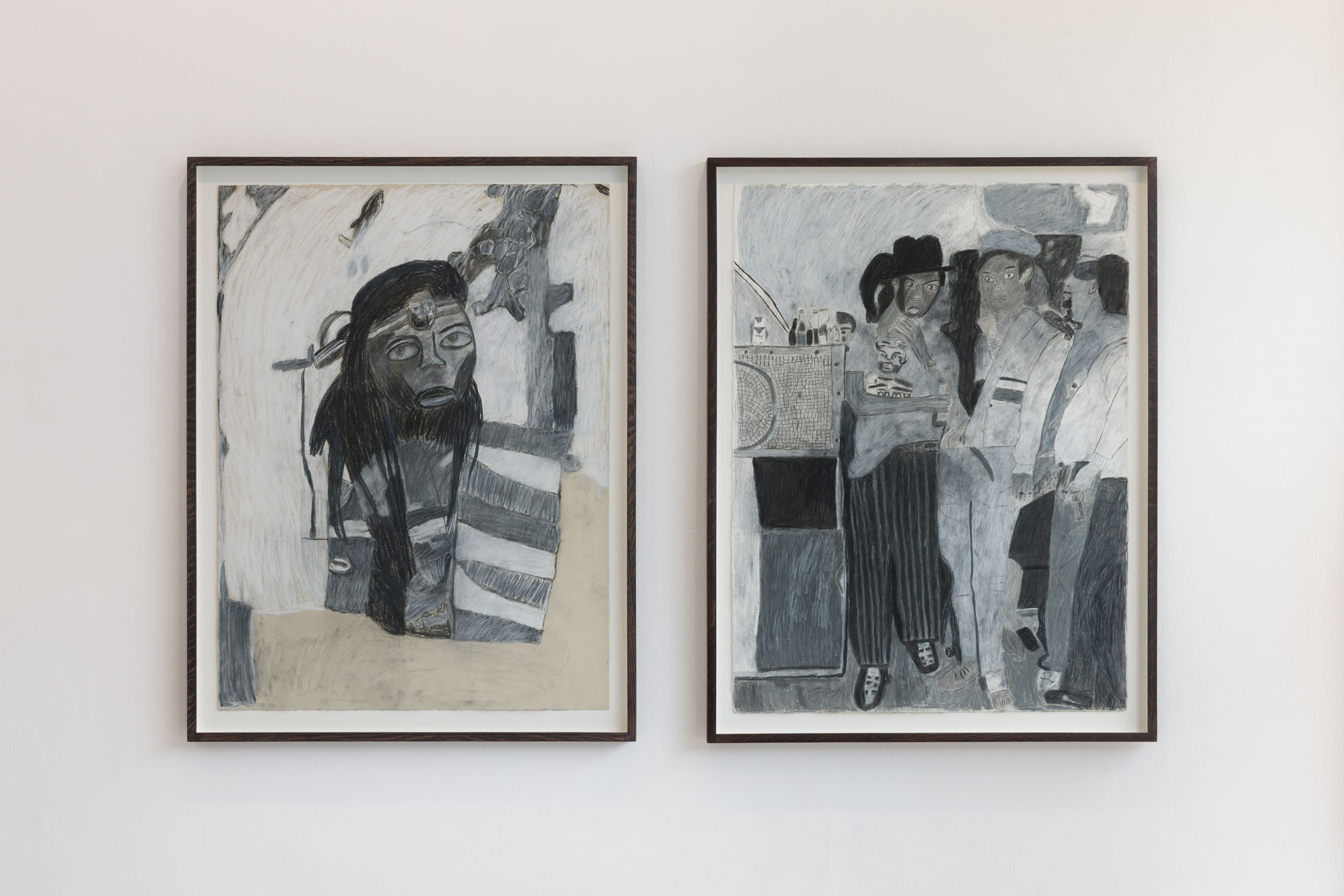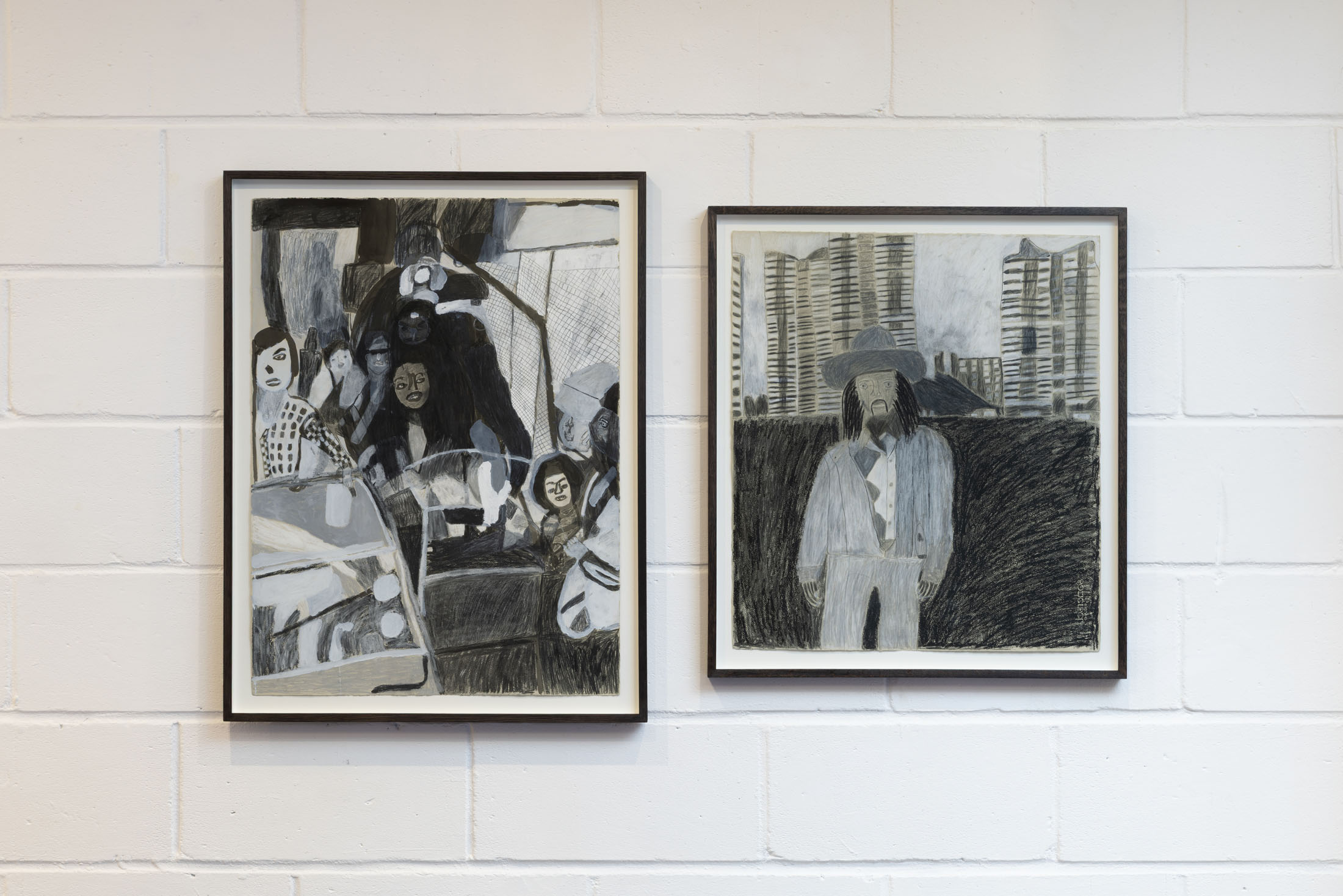 Alongside Eno-Amooquaye’s presentation, Dawn Wilson’s compositions of reggae sound systems in London, Birmingham and Kingston, Jamaica are drawn from black and white photographs documenting the historical significance of this cultural movement. Wilson captures a moment in time when two legends from the Jamaican music scene visited the UK in the mid 1980s, Bunny Wailer in London and Youthman Promotion Sound System in Birmingham. These deeply personal musical influences on her work demonstrate how music and the scenes that emerge from them derive form and can help shape personal identity and understanding. Examples can be listened to via her personal selection of cassettes included in the show.