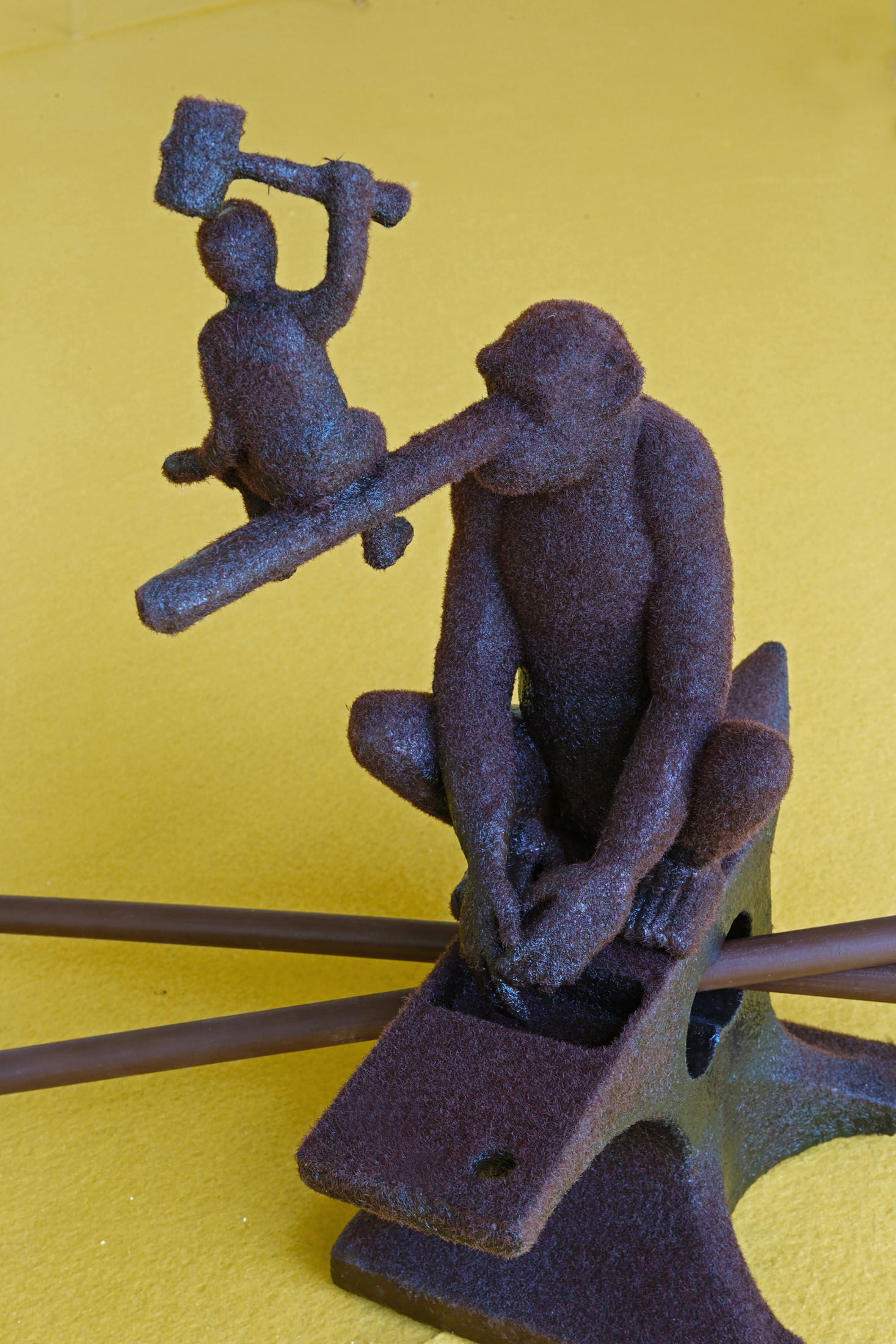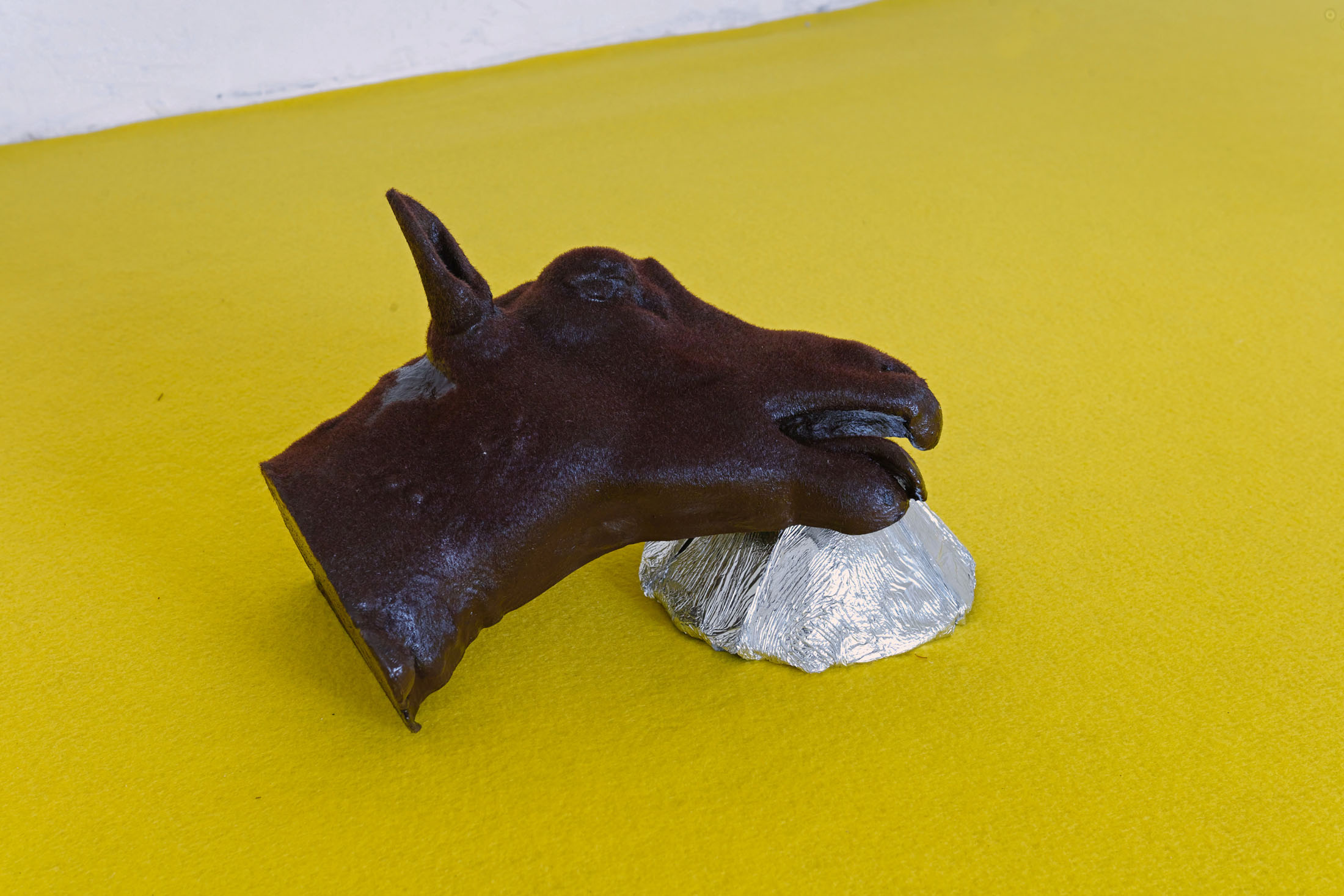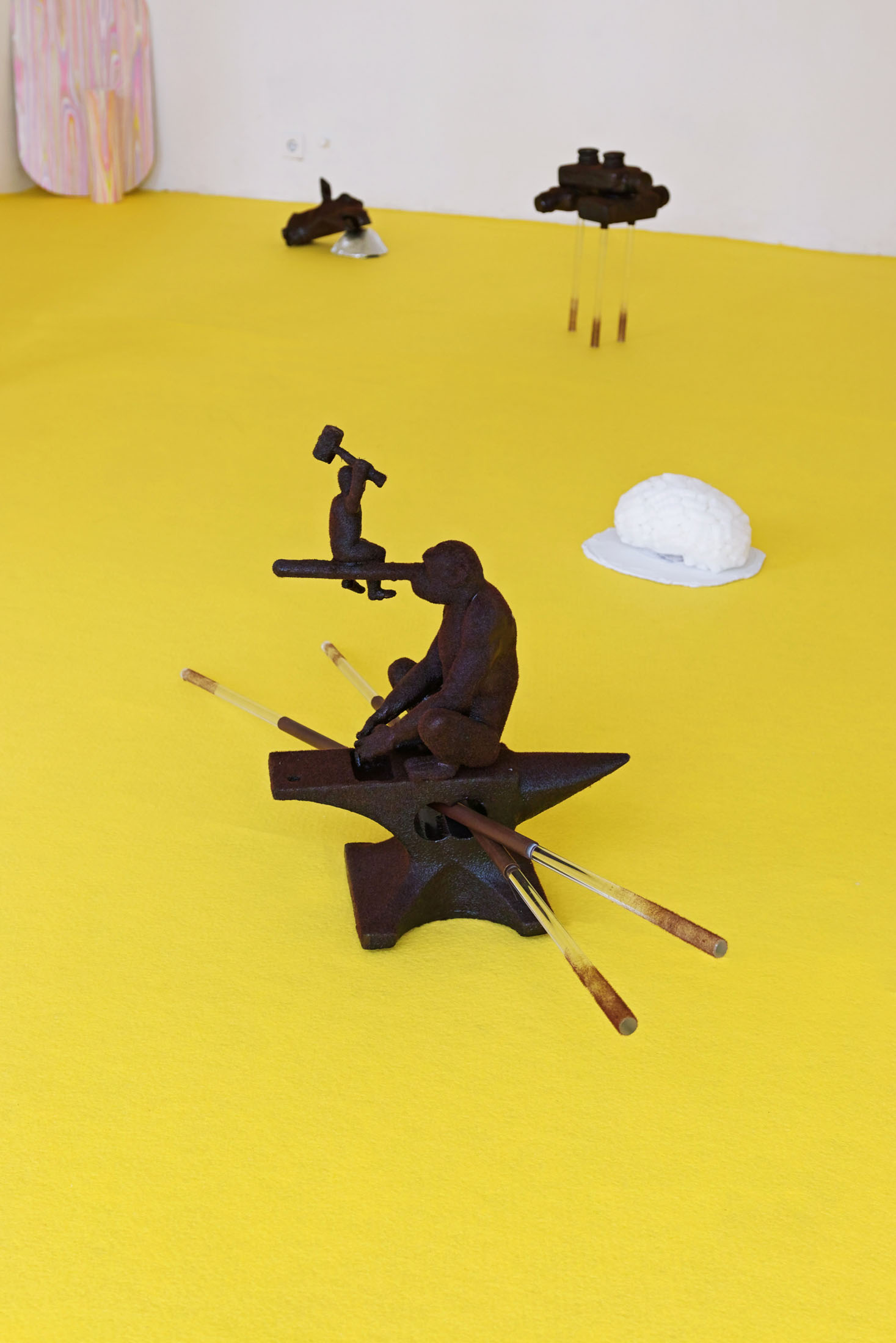 Wass and Obermair work with materials including rubber and plastic, as these stand like no others for the hybrid and fast-moving creatures of our time. The nature of these materials can be both virtual and physical. Their ambivalence ranges from the internet through actual industrial landscapes to the dystopian narratives that define our present. But they can also stand for self-empowerment in a culture of do-it-yourself and recycling. The artists link traditional design practices with mass-compatible technologies (Photoshop, AI, 3D printing) and follow society’s need to transfer original object animation into digital space. This media-driven “animization”—from Disney’s “animated cartoons” through animal memes to talking unicorns—makes the internet a refuge for the useless, cultic, and mythological. This movement is more than compensatory. The so-called modern era felt superior to animism and believed it could achieve a final separation between object, subject, society, and nature. That this was not helpful at all is shown by the fact that many of our problems between environment and politics have their roots precisely in this dichotomy. Obermair and Wass, on the other hand, feel more at home in a world that can be described as a network of living and non-living actants.