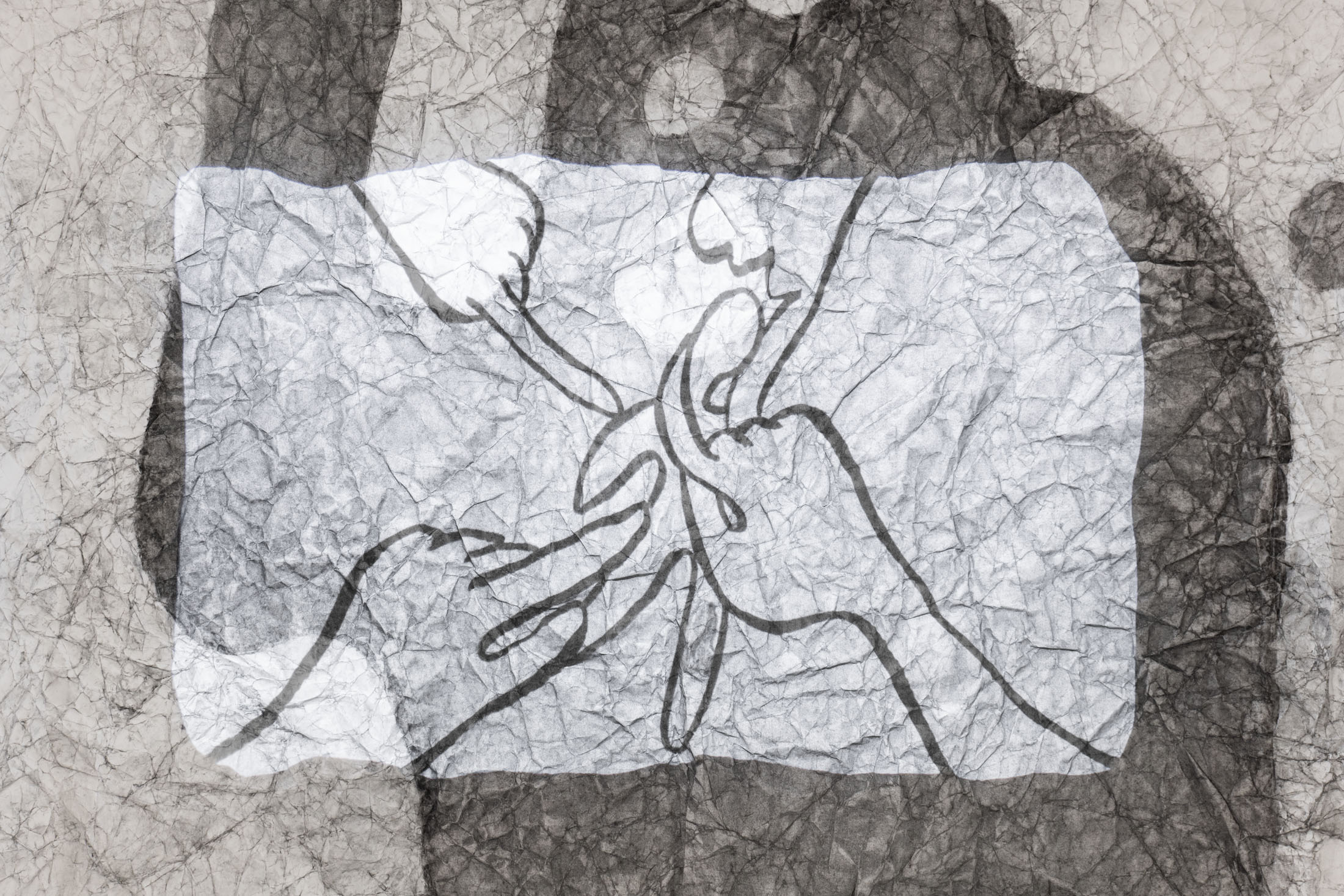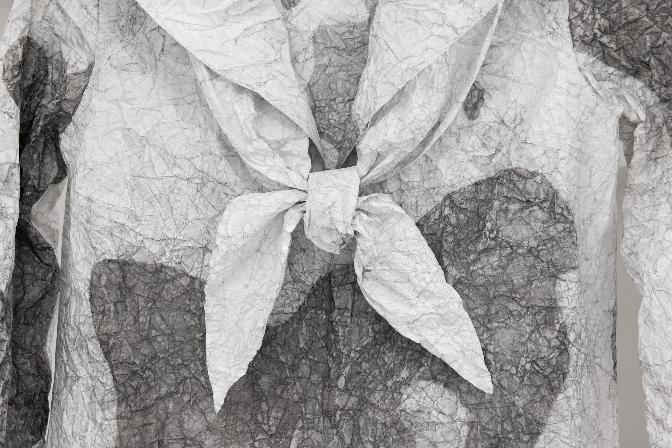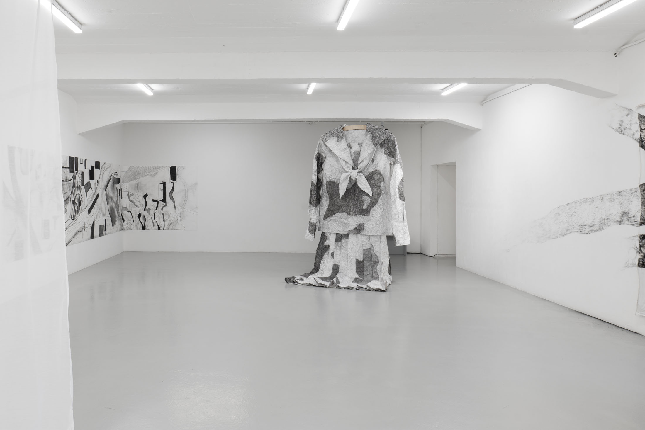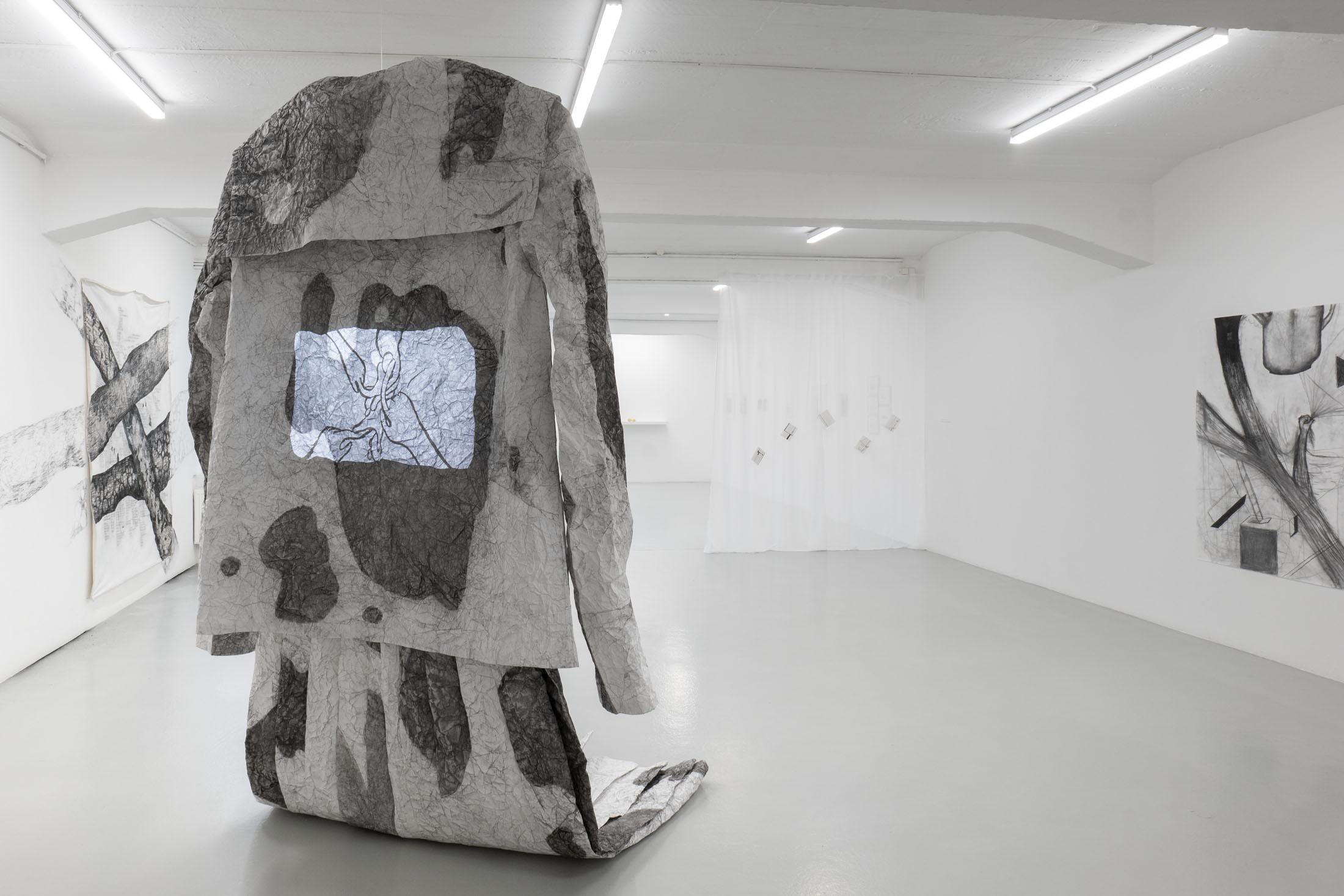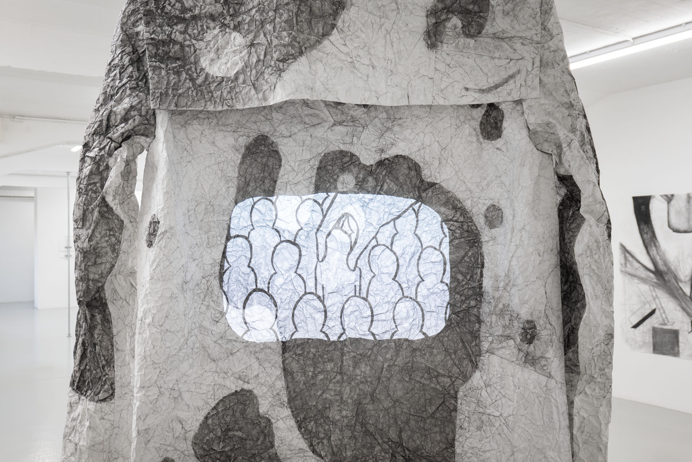The installation, uni (2025) – an oversized Japanese school uniform (seifuku) made of paper onto the back of which an animated film is projected – also arose from the combination of traces of memory and everyday observations. In this large-format installation, Seto works with memories of her school uniform, which she wore as a young girl in Japan, and adds her reflections on growing older. In Japan, seifuku are based on the design of military and naval uniforms from the Meiji era, making it immediately apparent which school the students belong to. At the same time, they create uniformity within the group, concealing social differences and individuality. Seto connects these demands for uniformity with social beauty standards, such as flawless skin without wrinkles or age spots, which she encounters in the process of growing older. To create the paper seifuku, Seto transferred pigment spots from her skin and that of her friends onto large-format paper. The artist enlarged the skin spots, which were actually only a few millimeters in size, to almost one meter in her drawings. She then crumpled up these drawings and tried to smudge the spots away by rubbing the paper together, similar to how she and her friends treat the spots on their skin with bleaching creams and lasers. The seifuku made by Seto defies the demand for uniformity with its folds and stains. She gives the uniform, a symbol of uniformity, an individual character.