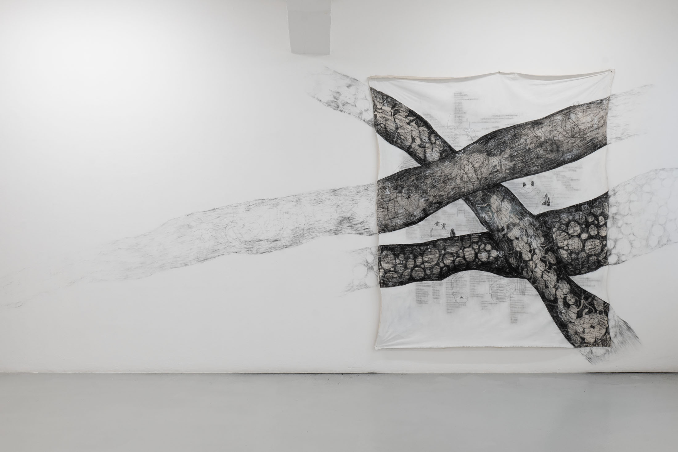 The drawing Du brauchst nicht zu antworten (You Don’t Need to Answer) (2025) shows large, branch-like structures that cross the piece of fabric serving as the ground several times and extend beyond its edges onto the wall. Playfully drawn feet, kidneys, and contact lenses can be made out in the branch-like structures. Between them are further small drawings of everyday moments over blurred, illegible lines of Japanese text. These lines of text are excerpts from texts written between the artist and her recently deceased aunt.
