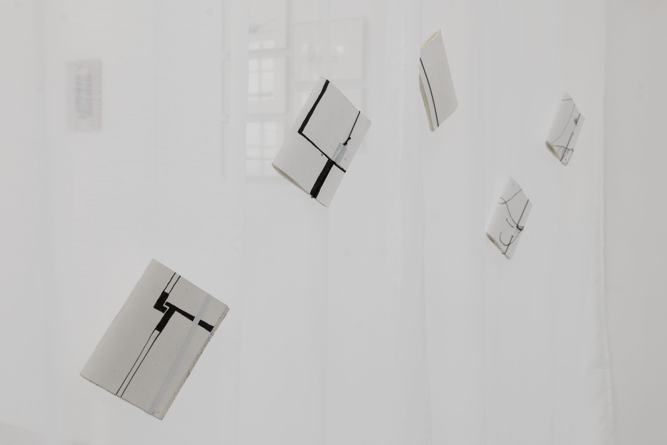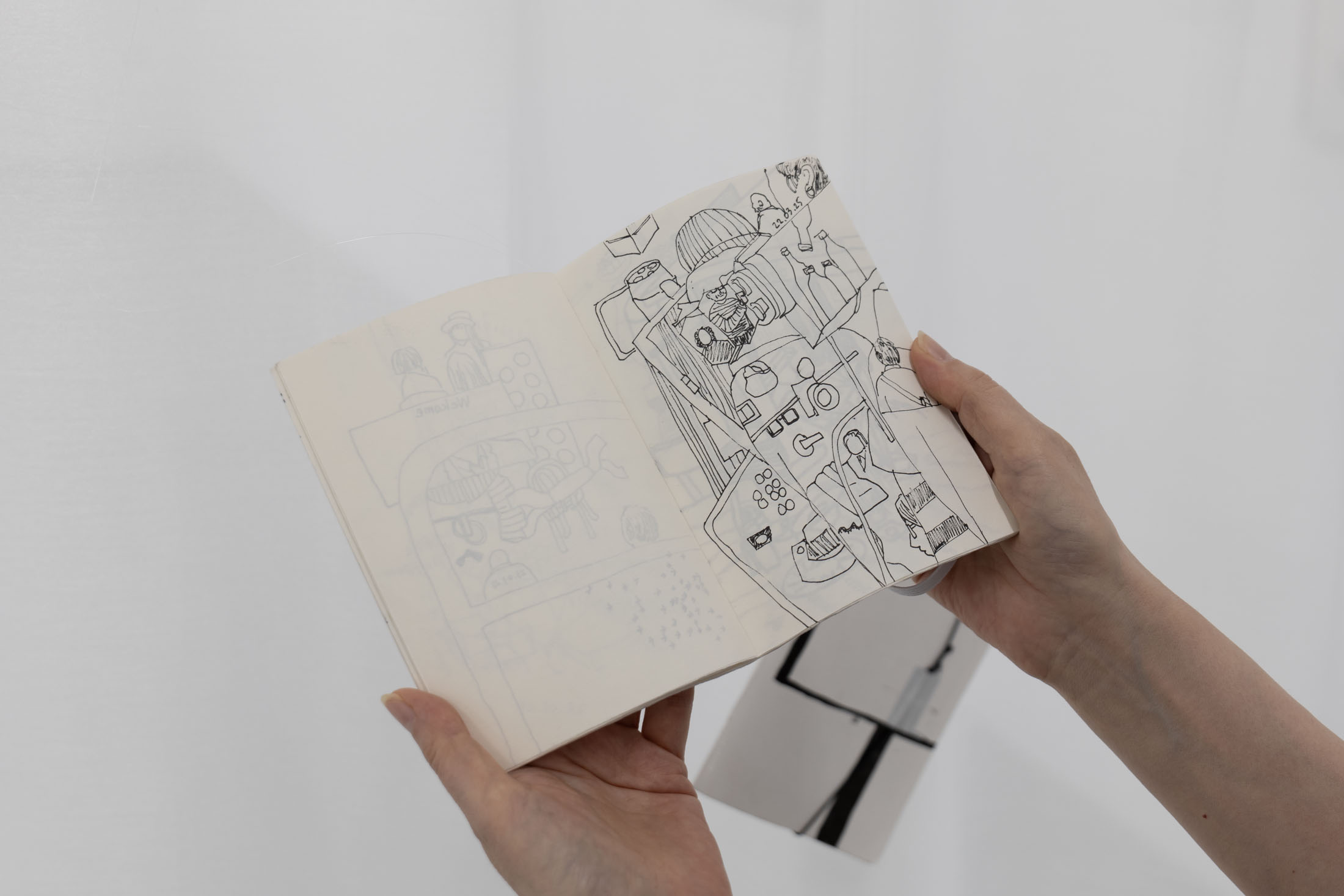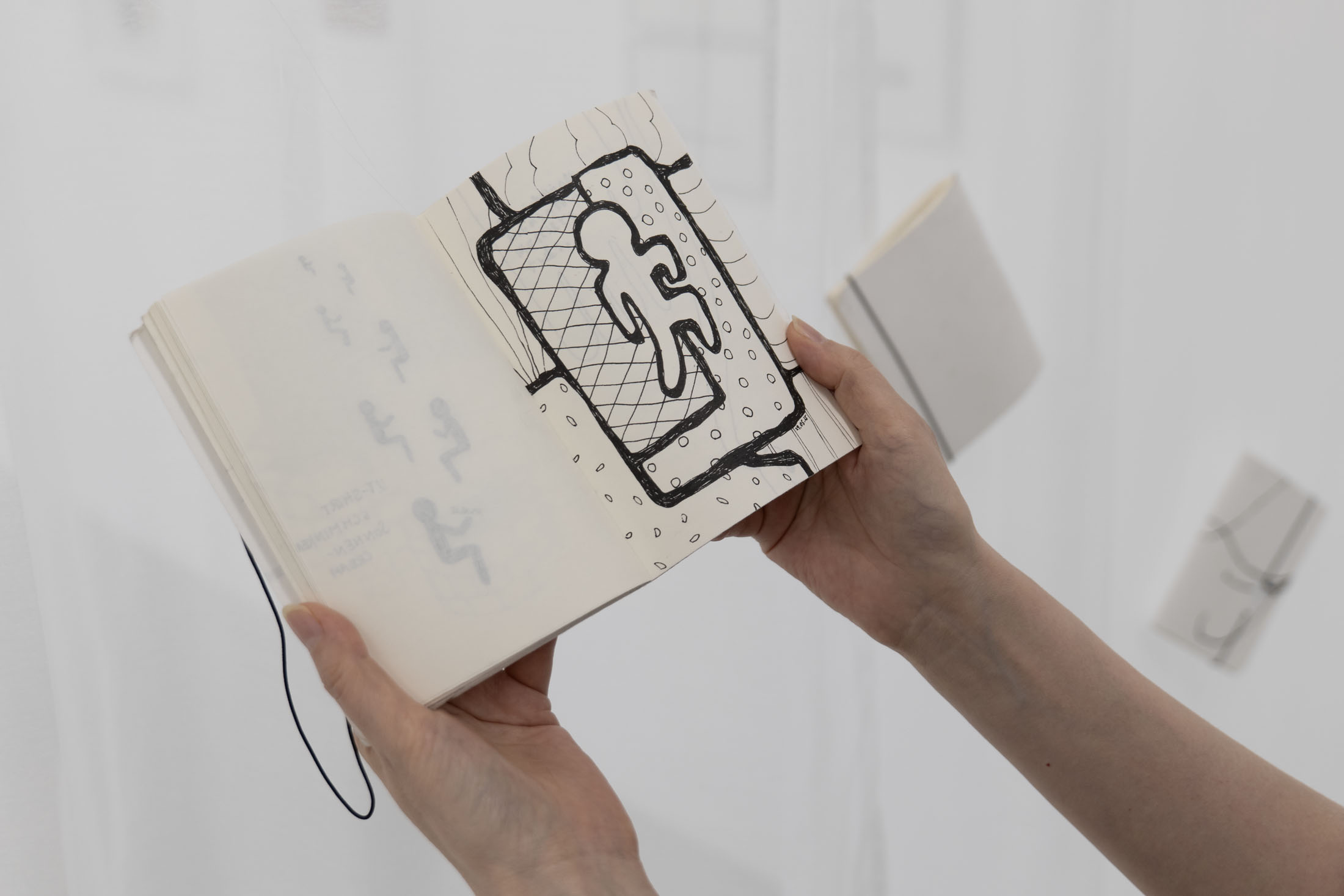 Drawing forms the basis of Seto’s artistic practice. Since 2017, she has been keeping regular drawing diaries to record her personal experiences. By capturing seemingly mundane things such as casual scenes, thoughts, and observations in her drawings, Seto quietly resists forgetting. In Spuren, she presents last year’s drawing diaries. The originals hang on thin threads in the room and can be leafed through. In addition, reproductions of the drawings can be purchased in an artist’s book compiled for the exhibition during the artist talk on 1 February 2026. Seto uses this practice of compiling, sorting, and reproducing as a form of reflection on the past year. For her, the drawings in the sketchbooks are also a kind of unit of measurement for (passing) time. Publishing them in turn offers the artist the opportunity to share her time with others.
