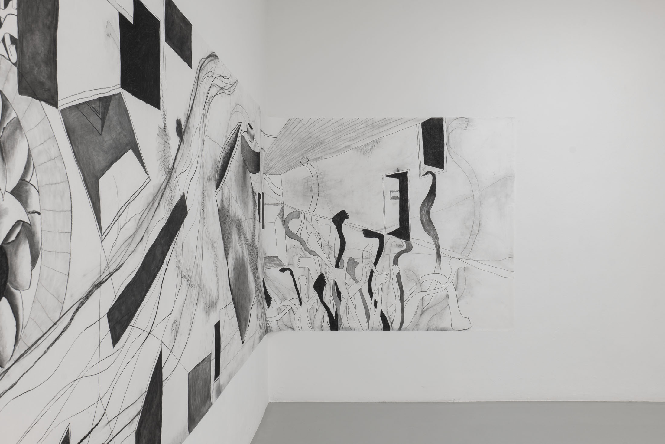 The drawing nacheinander (one after the other) (2025), which is over seven meters long, also presents various symbols, some abstract, some concrete: branch-like structures, paths, open doors or windows, geometric shapes and surfaces, abstract shapes and lines reminiscent of hair, a large cup, and several drawings of feet and legs – as seen in the work Du brauchst nicht zu antworten. (2025). Here, Seto interweaves her memories of visiting her friend in the hospital before she died with her memories of her aunt. What images emerge as memories when a person has passed away? Drawing becomes a process of remembering. Below the drawing Du brauchst nicht zu antworten. (2025) and at the bottom edge of the drawing nacheinander (2025), a narrow border of charcoal dust accumulates as a trace of the creative process. Just as not every impression returns clearly in the process of remembering, the charcoal trickles uncontrollably onto or next to the drawing surface. It leaves vague traces that can no longer be traced back completely.