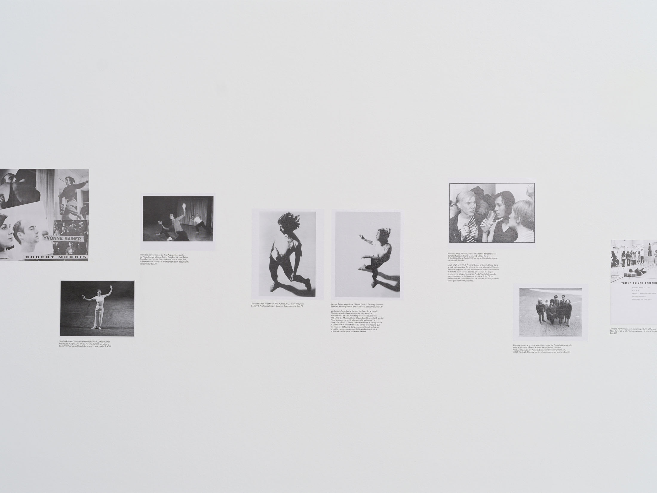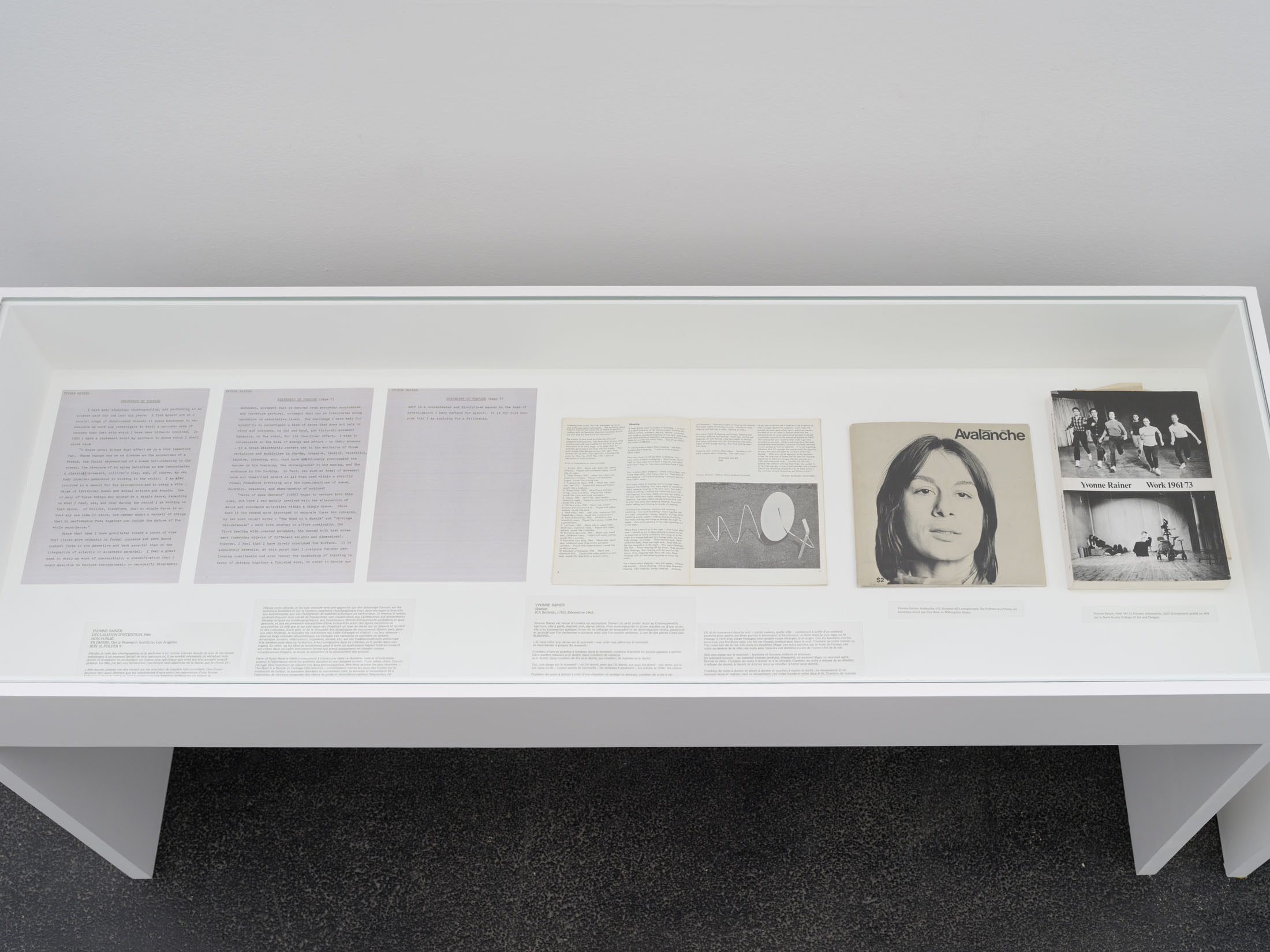 This format has been transposed into the art centre to create a novel form of interdisciplinary exhibition that brings together dance, cinema, performance, video, visual arts, literature, and archives. Dance after dance, performance after performance, film after film, essay after essay, Yvonne