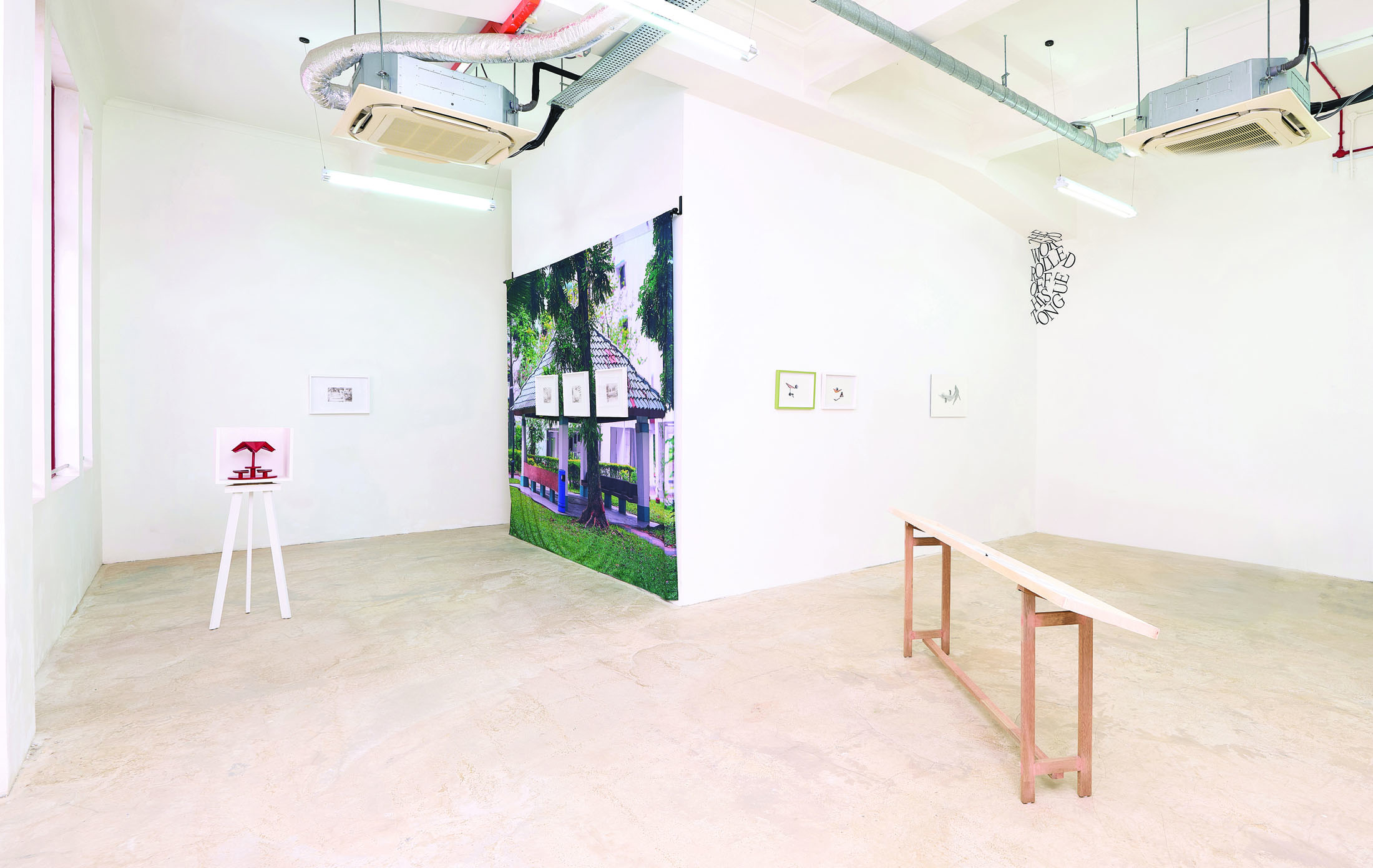In this context, the pavilion also serves as a mnemonic structure and “monument” for its capacity to evoke formative memories and its potential to accommodate other structural significance. Through paintings on photo paper, collages, sculpture, and narrative writing, Zulkhairi inflects the vernacular structure with play and desire.